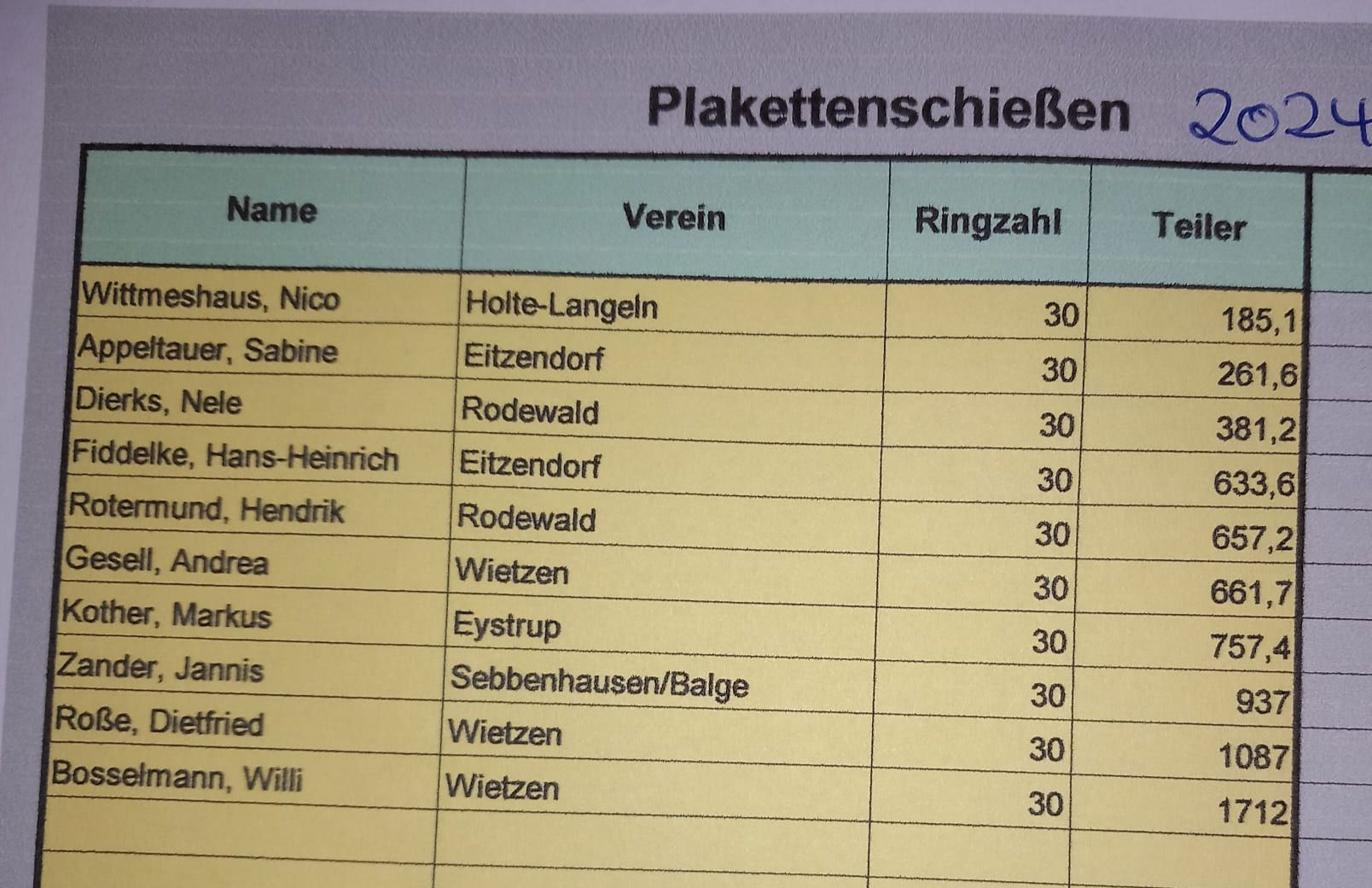 Desweiteren wurden fünf Plaketten ausgeschossen, die an folgende Mitglieder überreicht wurden: Carina Meyer, Lars von der Behrens, Melanie Michaelis, Rita Schemel und Dörthe Andermann.